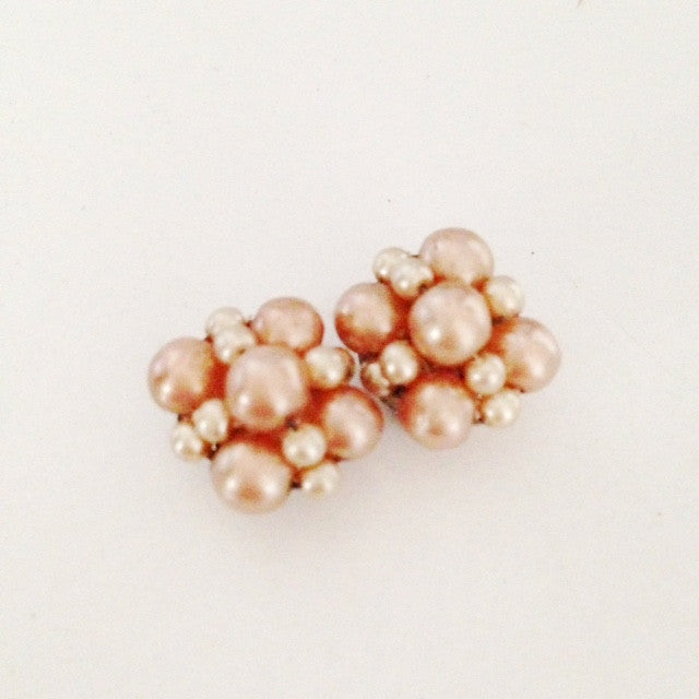 Lovely peachy pink, pearl cluster clip ons. These earrings would add a perfect touch of vintage elegance to any outfit.