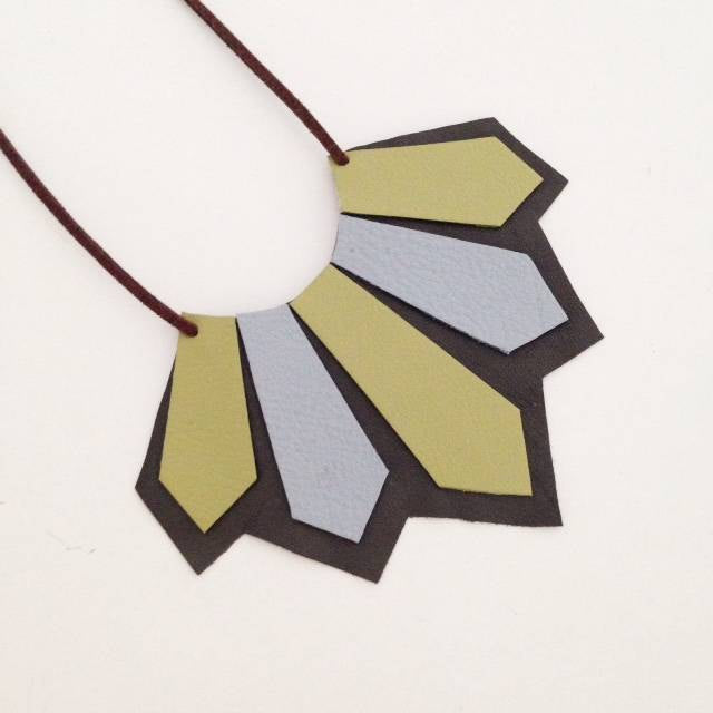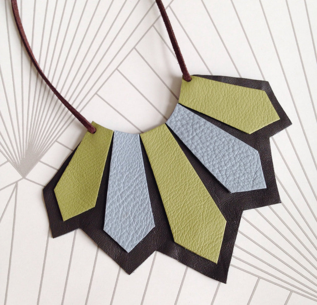 A beautiful hand cut leather necklace inspired by the Art Deco Era. Chic and simple in shades of pale grey and green it sits flatteringly on the neckline. It has a claw fastener and extender chain. All necklaces come boxed and tied with a pretty bow so make a great gift.