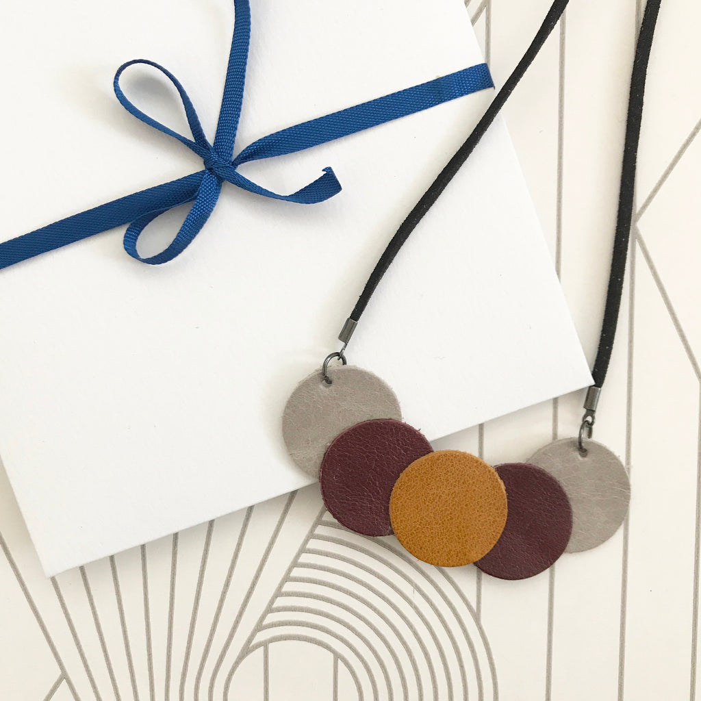 A contemporary die cut leather necklace. In grey, maroon and mustard leather. Simple and stylish.