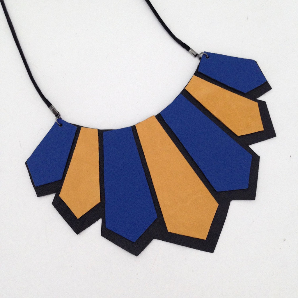 A hand cut leather necklace in gorgeous shades of mustard yellow and royal blue. Art Deco inspired but with a contemporary feel. A real statement piece.