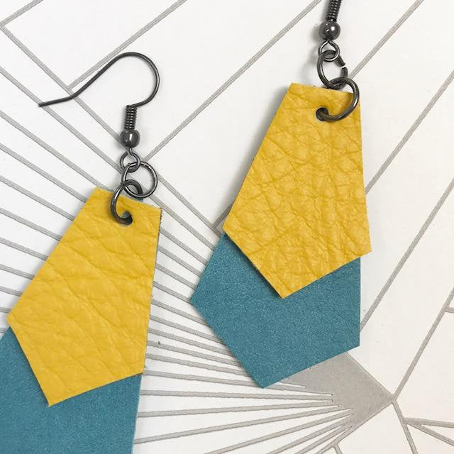 Hand cut leather earrings. Turquoise base with a pop of yellow. Contemporary but at the same time having an Art Deco feel.