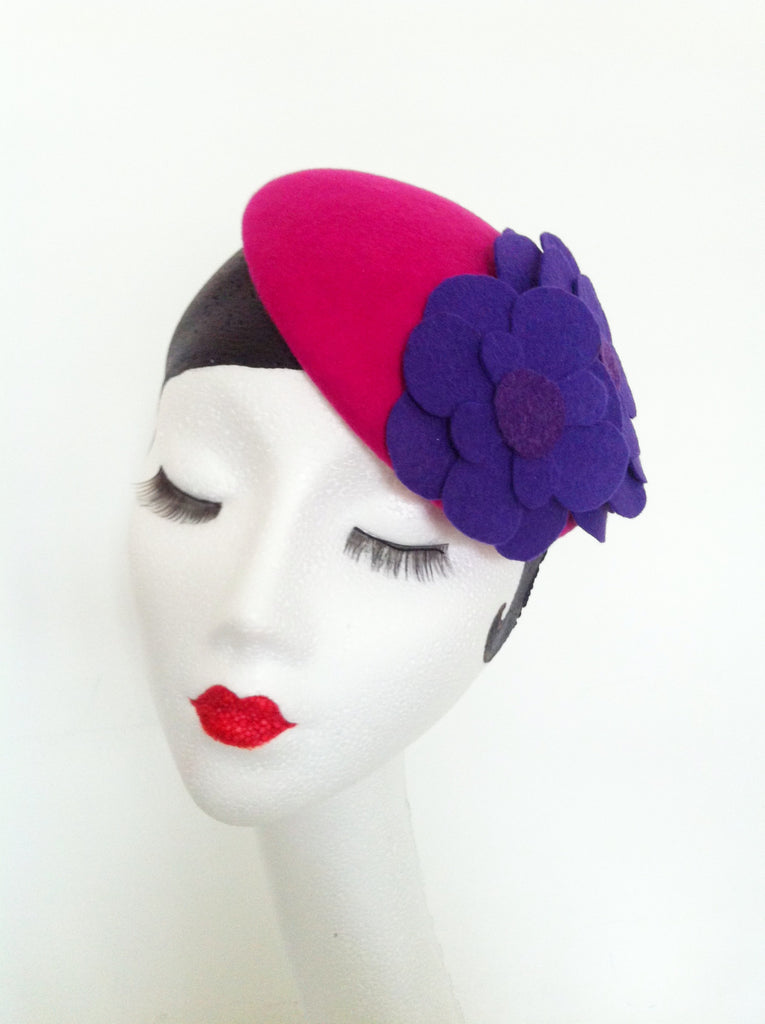 This gorgeous, fuschia pink, wool felt, percher is topped off with two hand made purple felt flowers. Delicious!