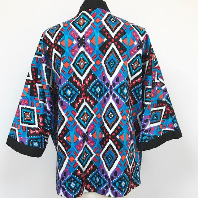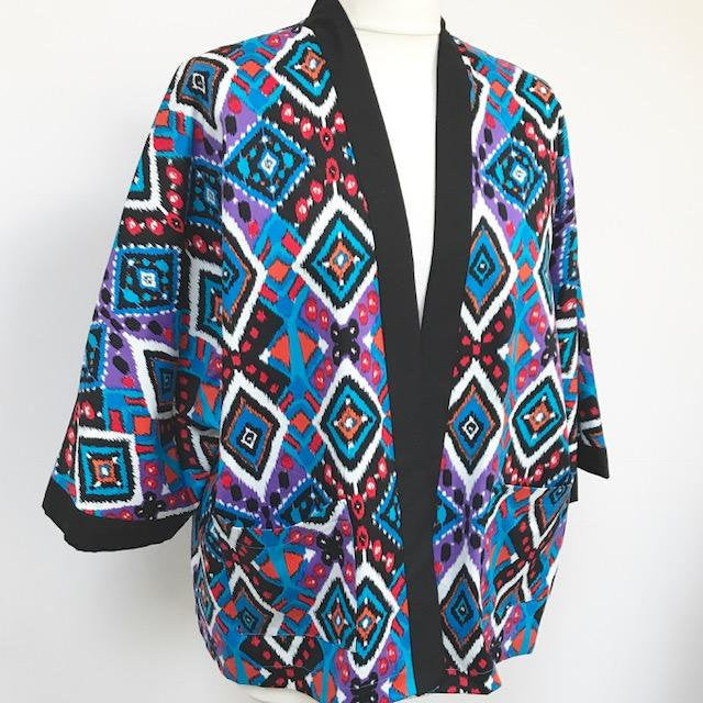 A gorgeous jacket with Kimono sleeves. A boxy style with square front pockets. Handmade in a lovely, colourful, Aztec print cotton. In purples, turquoise, black and white the fabric has a slight stretch to it for added comfort when wearing. In medium weight cotton and bound with a wide black binding the perfect little throw on for day or evening.