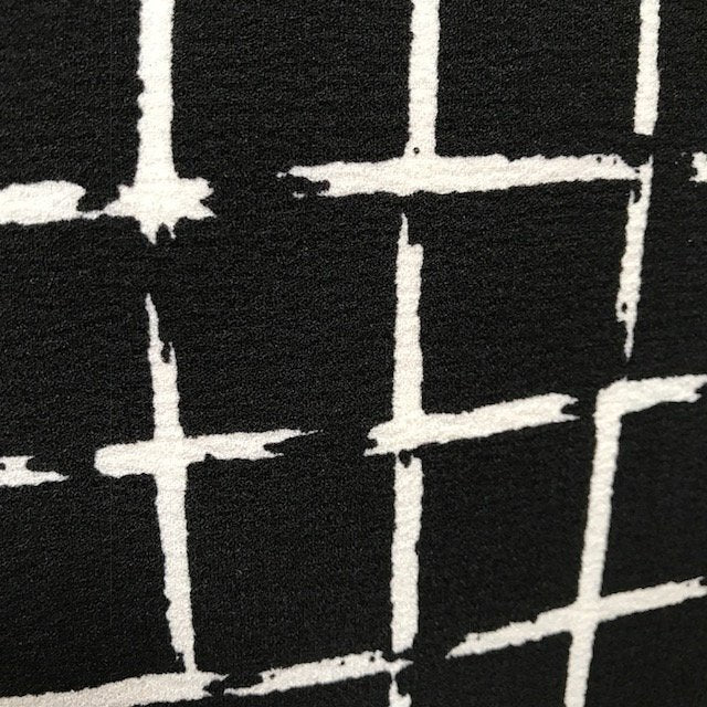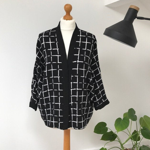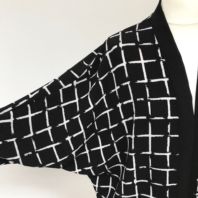 A black and white Jacket in a big, bold contemporary check. This crepe fabric hangs beautifully and is lovely to wear. It has batwing sleeves and is finished with a wide black binding.