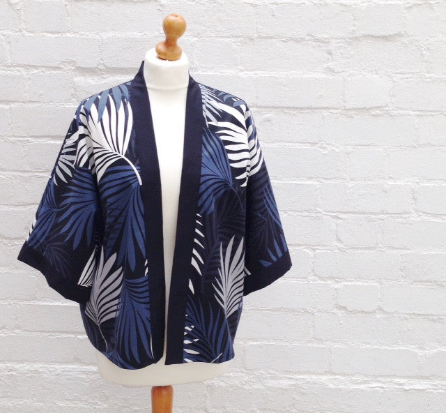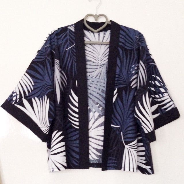 I love this large leaf print Kimono in shades of grey, blue white and black. It's a shorter length so sits just below the waist. Handmade with love.