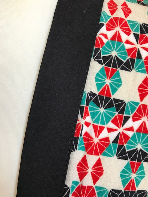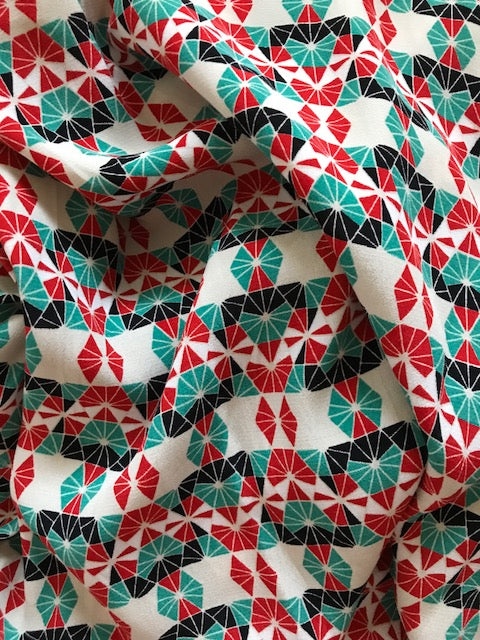 This batwing jacket is made in a gorgeous, geometric Art Deco style print. In turquoise, red and black drapey crepe fabric. Perfect for lounging or to throw on for an evening.