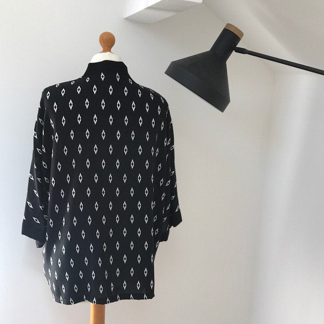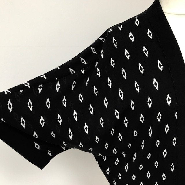A lovely black and white kimono jacket in a soft drapey viscose. It has a white geometric ikat style print. The front and sleeves are finished in a wide black binding.