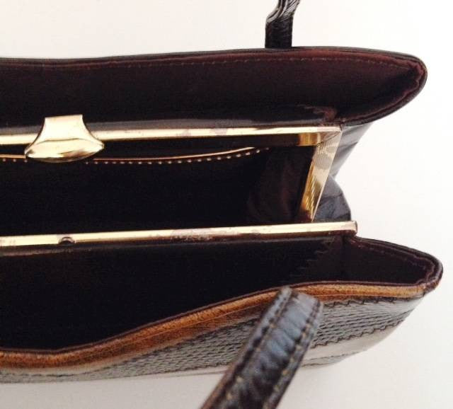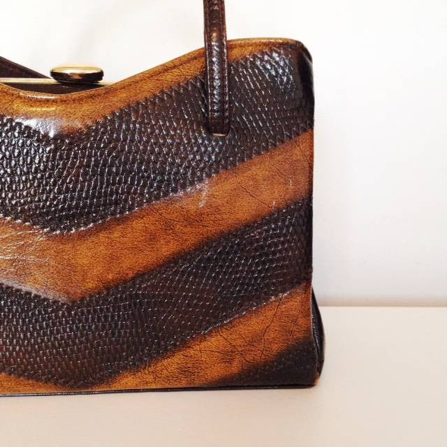 Unusual brown and tan chevron striped bag in faux snakeskin. One not to be missed!