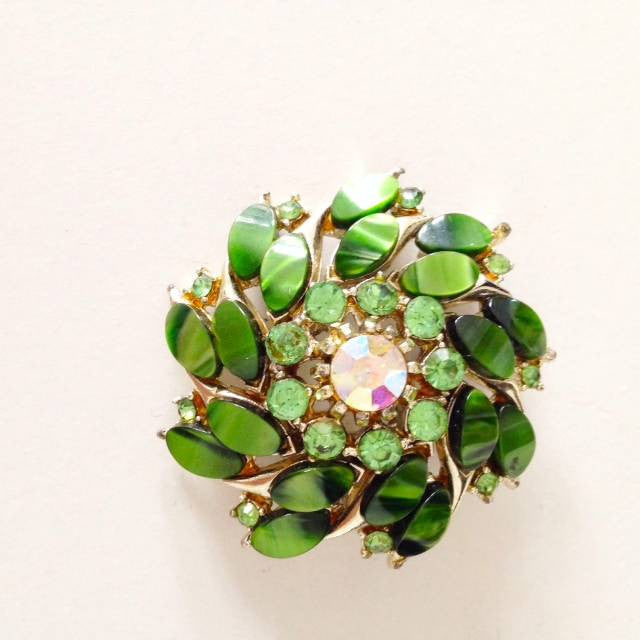 Beautiful swirling green thermoset brooch. Adorned with green rhinestones and a sparkling aurora stone in the middle. A truly stunning piece.