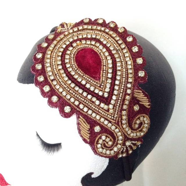 Dark red and gold paisley shaped 1920s style headband. A lovely handmade piece to add a little unique glamour to your outfit.