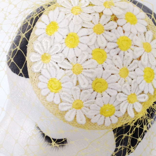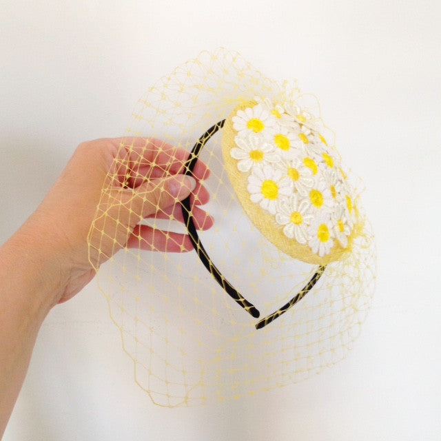 This best seller is now back in stock! A very sweet handmade daisy fascinator. White daisy flowers on an 11cm sinamay base with primrose yellow veiling on a black headband. Perfect for a Summer wedding.
