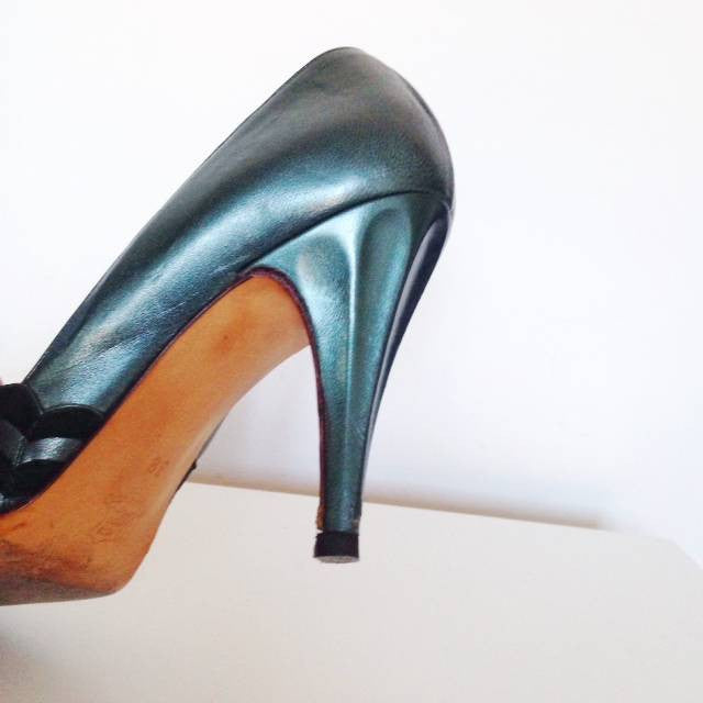 These are gorgeous, in green suede with a leather Art Deco pattern and a shaped heel to die for. They had the original receipt in the box dated 1983! That makes these beauties 32yrs old.