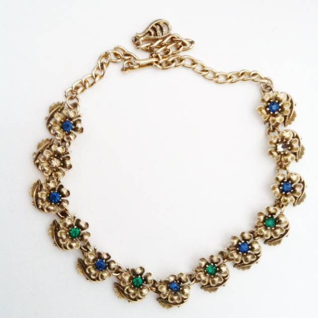 A really very pretty goldtone necklace. Each flower is set with either a blue, green or clear, sparkling glass stone. A sweet addition to any neckline.