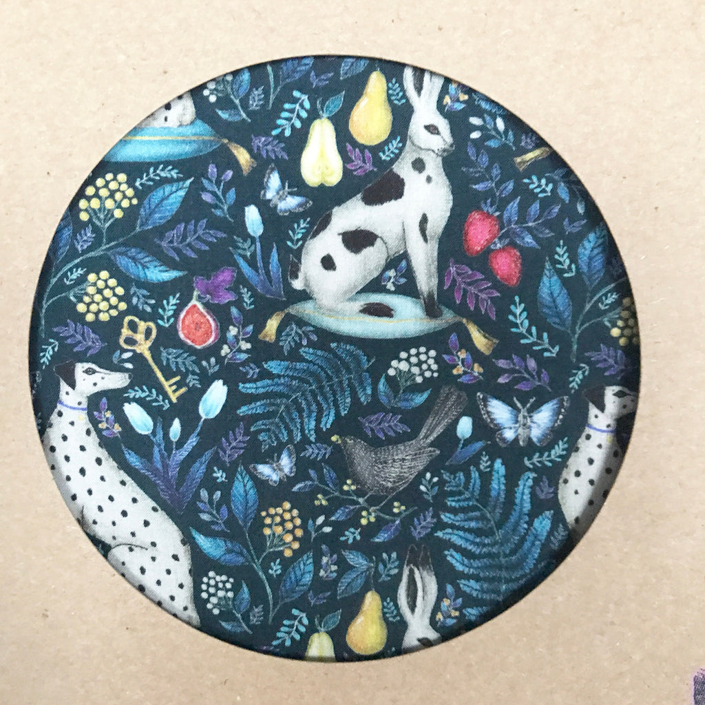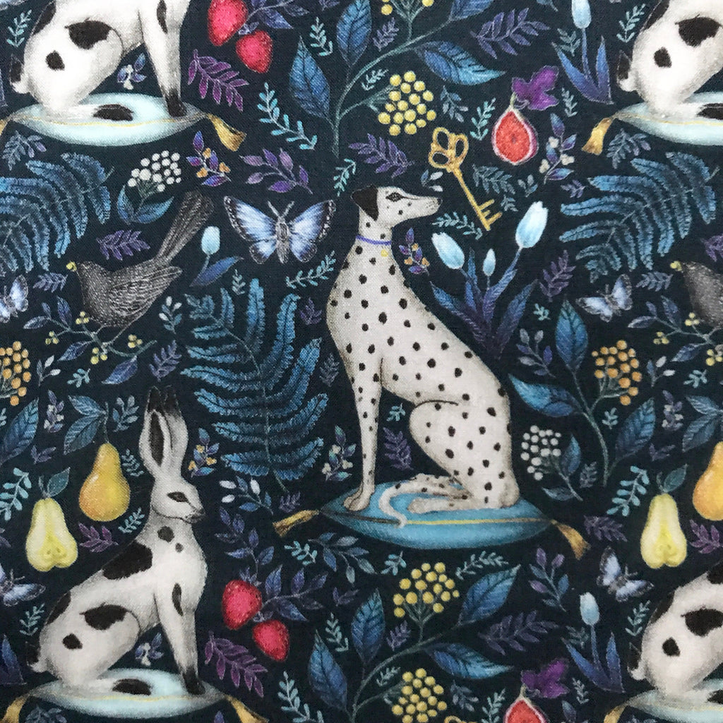 A gorgeous Print of dalmations, hares and fruit.