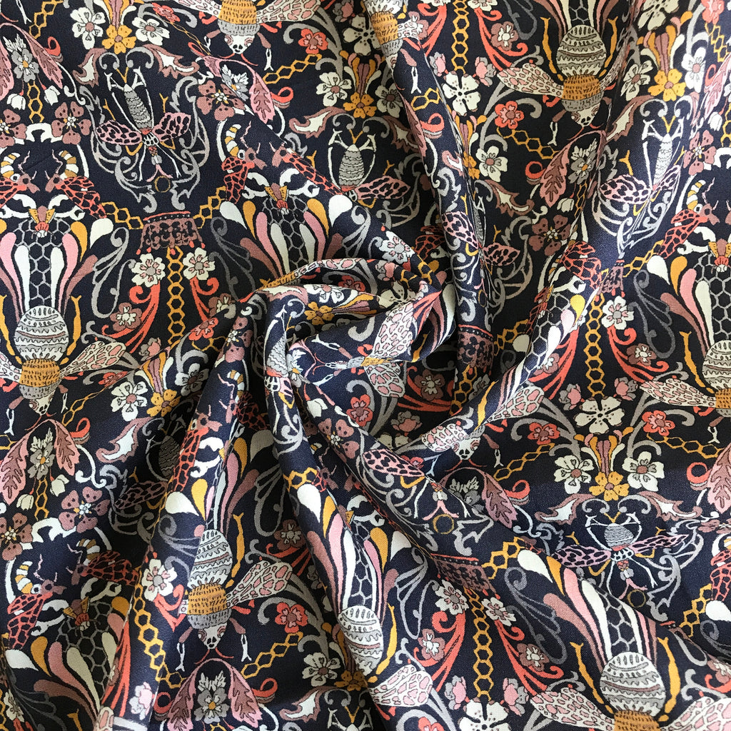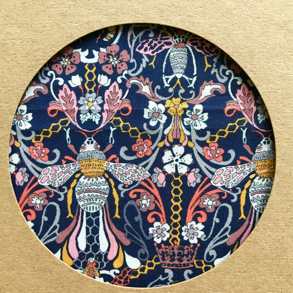 An Art Nouveau inspired design of bees and flowers in shades of pink, violet and yellow on an indigo blue background.